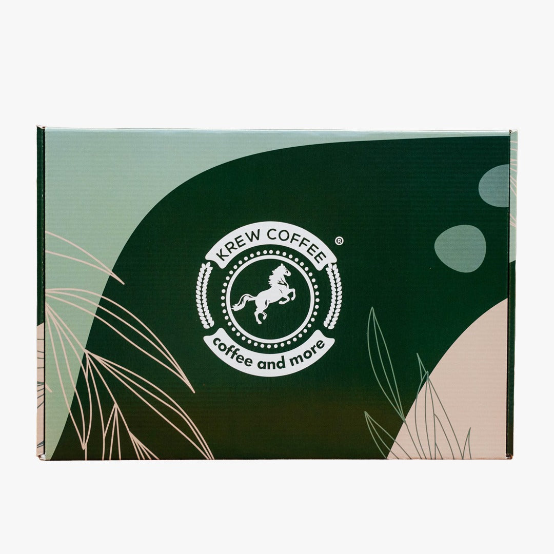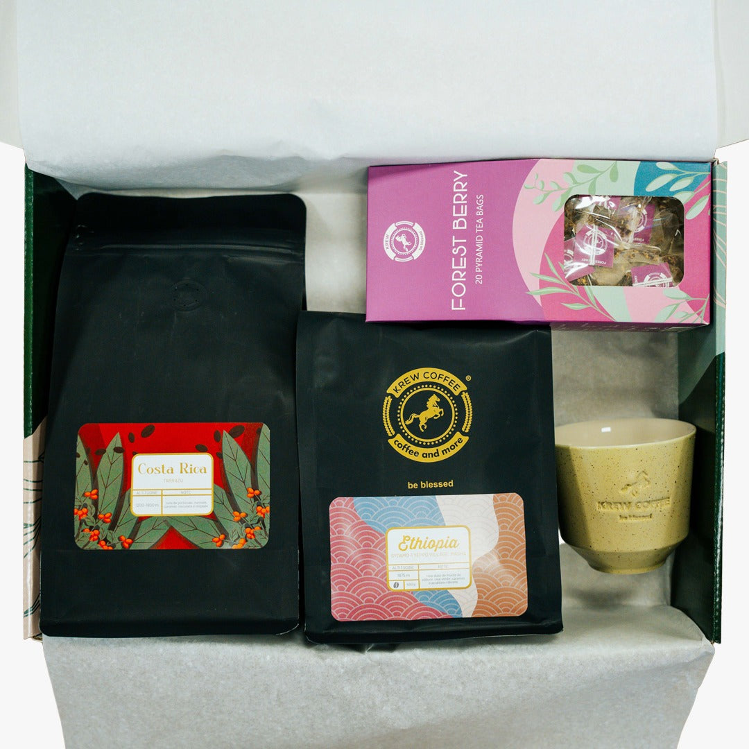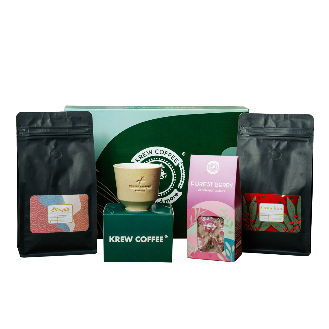 Un cadou rafinat pentru cei care iubesc aromele autentice. Setul include două cafele de specialitate: Costa Rica (500g) și Ethiopia (500g), un ceai parfumat Forest Berry și o ceașcă Krew Coffee (180ml).