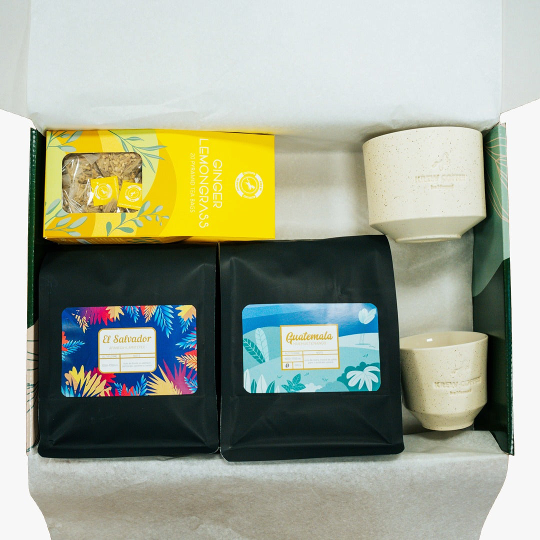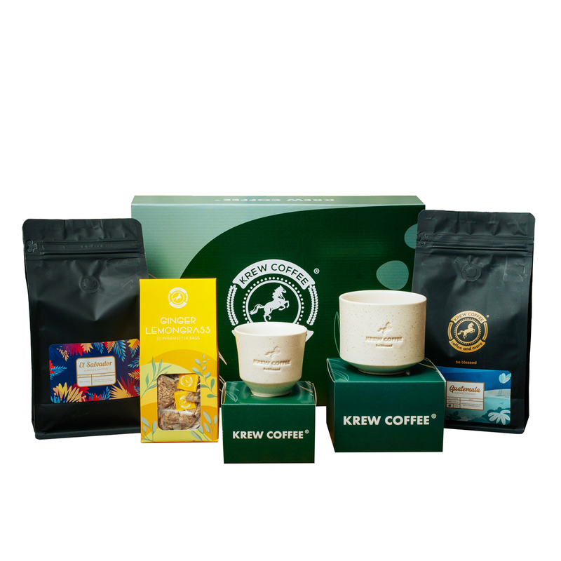 Un cadou premium pentru iubitorii de cafea și momente autentice. Setul conține două origini de cafea de specialitate: El Salvador (500g) și Guatemala (500g), un ceai aromat Ginger & Lemongrass și două cești Krew Coffee (300ml și 130ml).